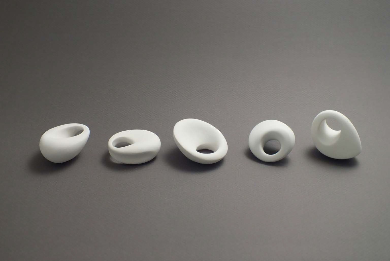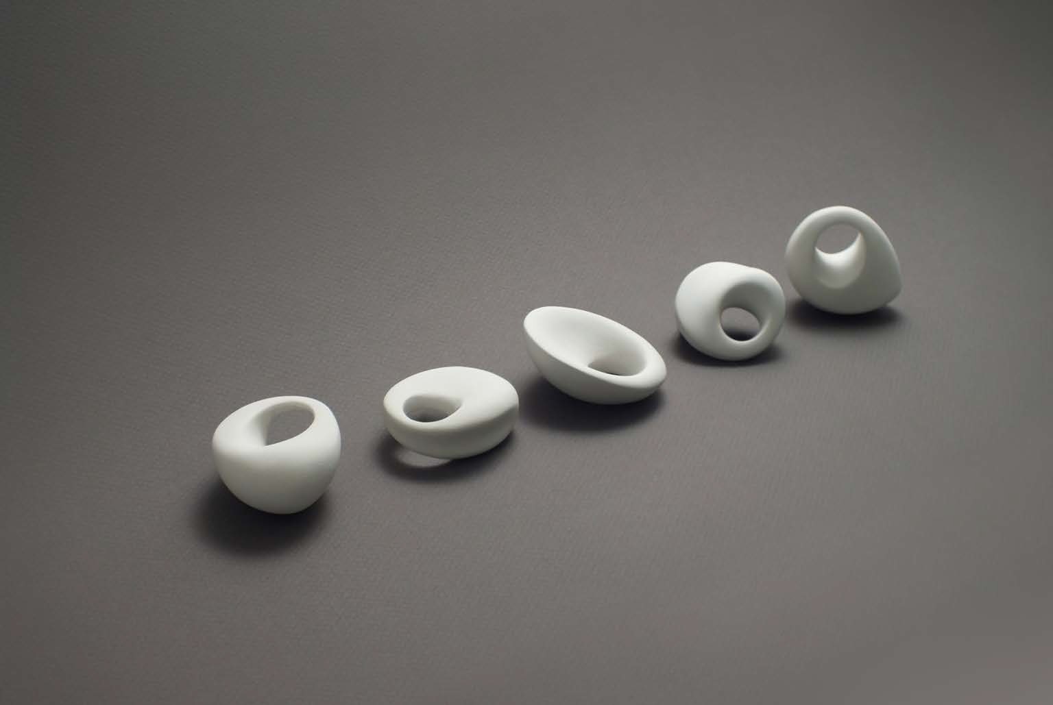 In this series each ring is carved from from a single bone-hard block of porcelain. Each one is one-off, each one is unique. The crafting of these objects is a very essence of their meaning, the value of the object.
