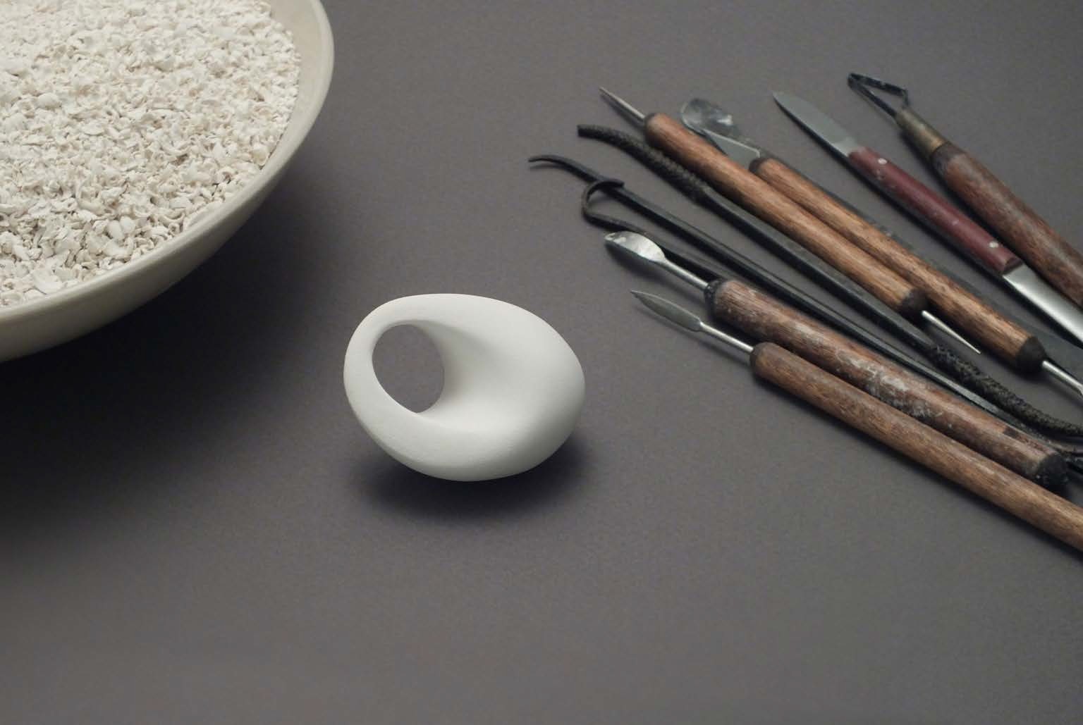 Lena wanted to give others, through those items, her most precious, most imaginative time, involve all her knowledge and skills, so to say- craftsmanship. Each ring is about 3 hours of precise carving, sculpturing, and really poetic work. Very slow process, very creative process, without technical work like in the process of slip casting or other mass production techniques. The artist is as close to the object as possible. She would like to think that someone will own it, and use it, actually taking it into their lives, this is meaningful. From hand to hand- this is a new luxury.